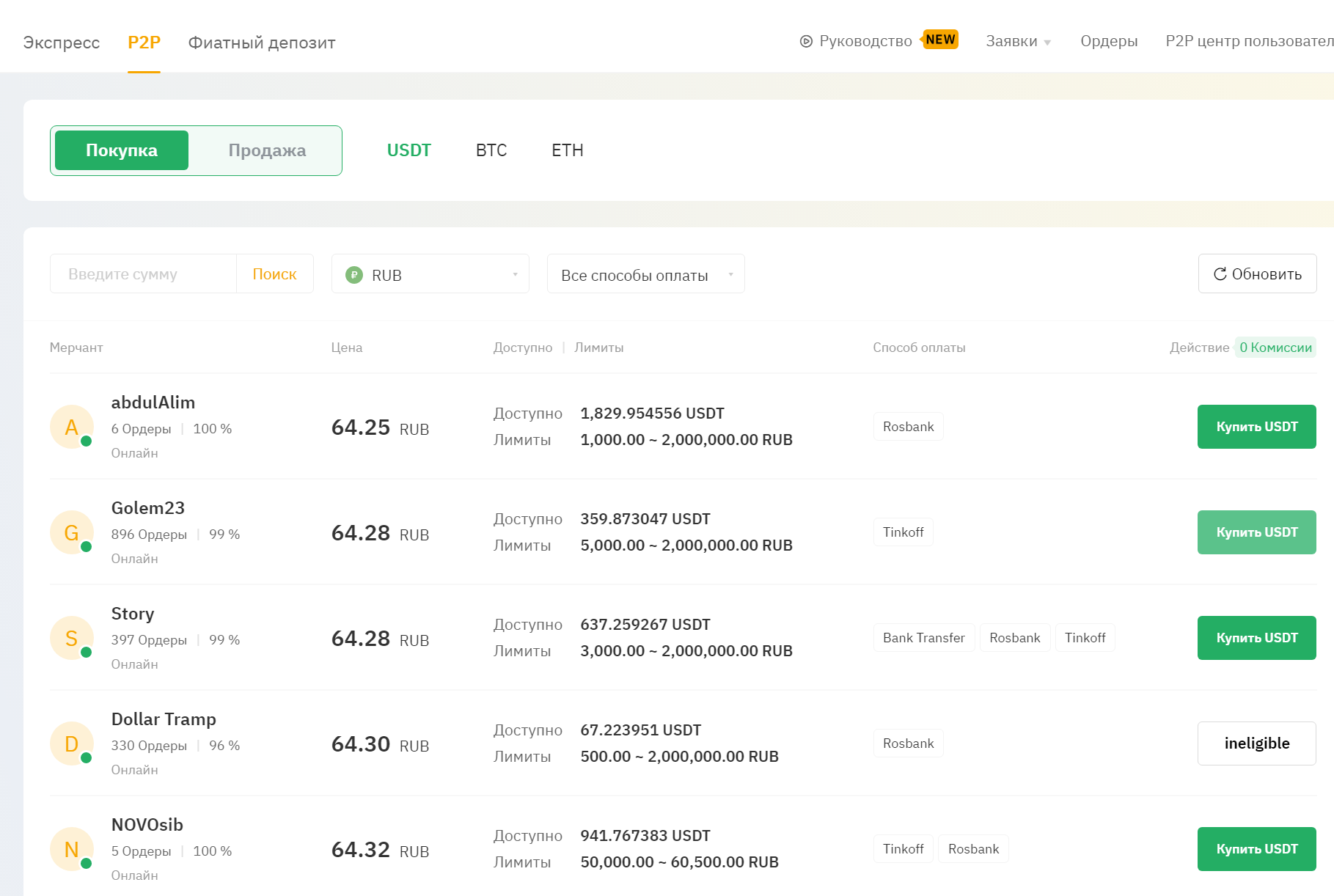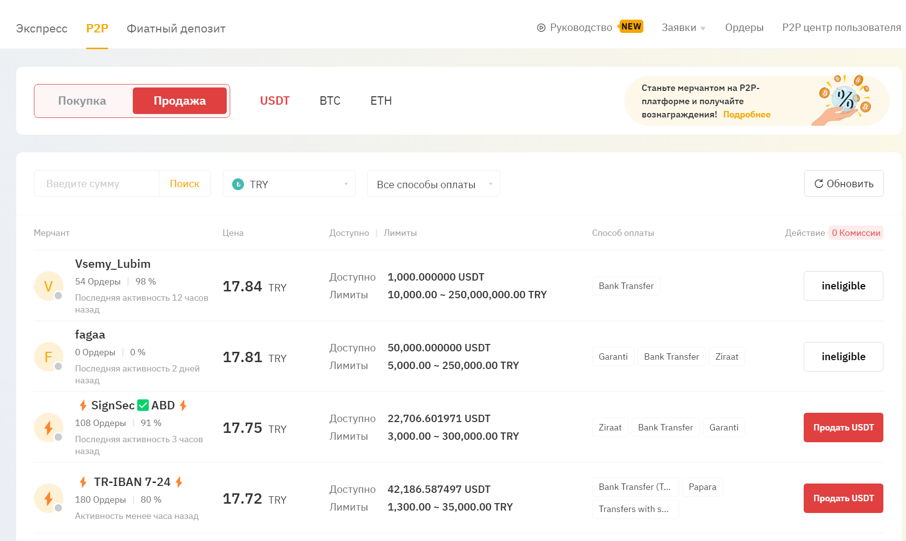 - После обновления списка нажмите «Купить», укажите желаемую сумму и следуйте дальнейшим инструкциям на сайте. По завершению сделки на вашем счету появятся USDT, которые нужно обменять на турецкую лиру.
