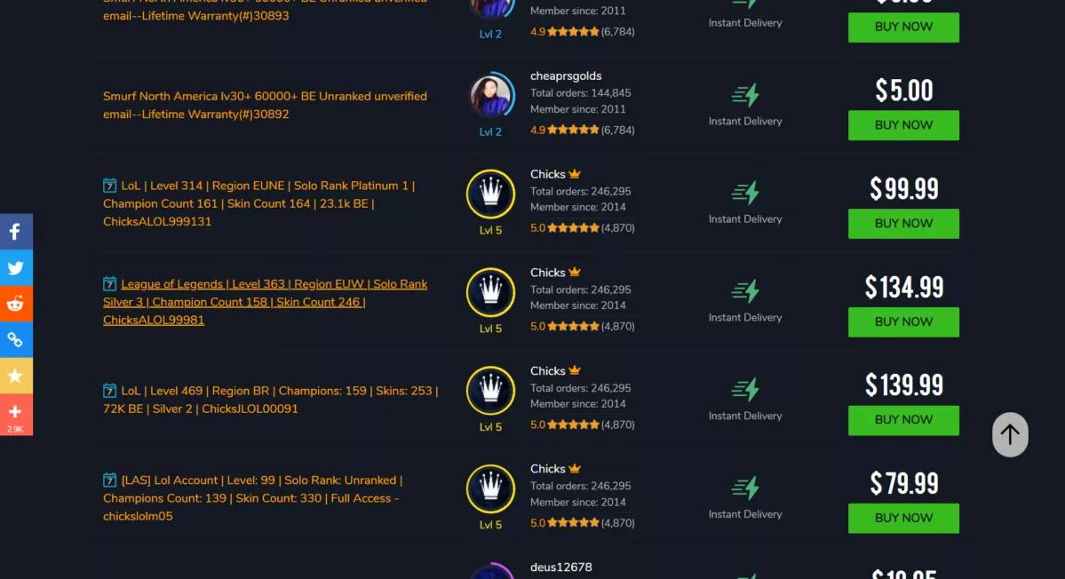 С учетными записями это самый большой выбор на рынке, поскольку это самая популярная покупка среди этих типов платформ с этими игровыми товарами . От Steam до Overwatch 2, Valorant и League of Legends