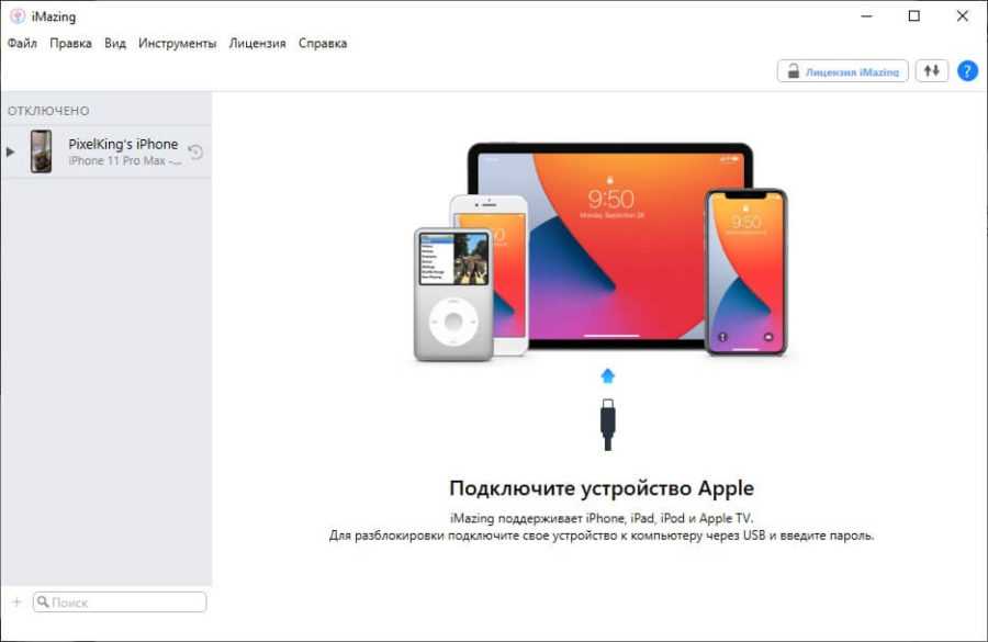 - Установите программу, а затем запустите и подключите iPhone к компьютеру по проводу;