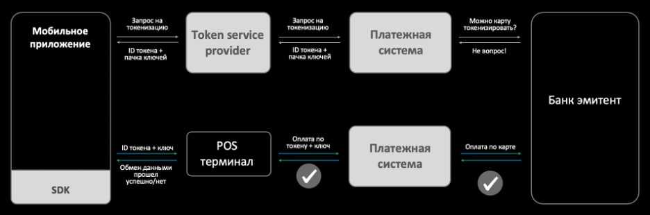 Токенизация карты — это технология преобразования конфиденциальных данных банковской карты в специальный токен, с помощью которого можно оплачивать покупки. Схематично токенизация и оплата выглядят так: