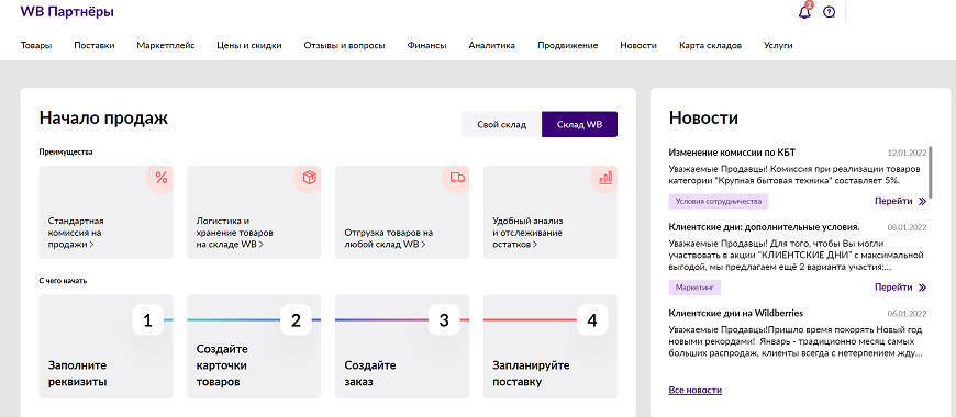 Здесь нас ждет с десяток разных полезных вкладок, кликнув по которым можно узнать условия сотрудничества, где находятся склады, на которые нужно сдавать товар, правила реализации товаров на Wildberries и еще много всего.