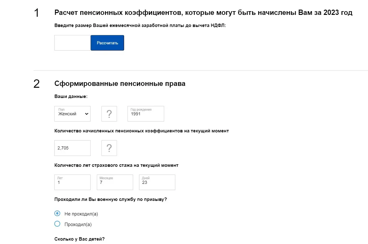 Как правило, через час можно вернуться в раздел и посмотреть размер пенсии. На сайте Госуслуг Ещё один способ — рассчитать пенсию на калькуляторе портала Госуслуг. Нужно самому ввести свои данные: размер зарплаты, как планируете работать до пенсии найм или самозанятость , планируете ли проходить военную службу и так далее.