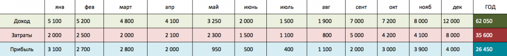 Следующим шагом, определите размер расходов компании в каждый месяц в году. Это могут быть: затраты на покупку материалов, оплату сотрудников, аренду площадей, налоговые выплаты и др.