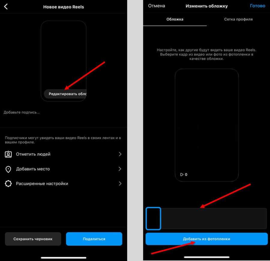 Обложка есть у видео в любом случае. Оно появляется после того как рилс был записан и человек нажал на кнопку «Поделиться». Однако, иногда оно не соответствует необходимым требованиям, ее меняют. На экране устройства появится поле с надписью «Обложка», нажав на нее можно изменить изображение видео.