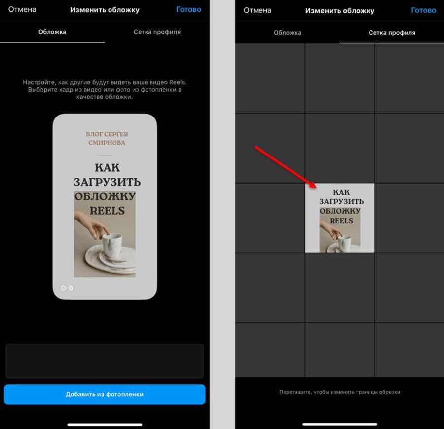 Кстати, если в верхней части интерфейса нажать на кнопку «Сетка профиля», то социальная сеть отобразит и то, в каком виде Reels появится в профиле. И, если немного просчитаться (как, например, сделала редакция блога Сергея Смирнова), то некоторые детали в кадр не попадут, из-за чего, возможно, восприятие контента у потенциальной аудитории незначительно, но поменяется. А потому лучшее заранее просчитать каждую деталь и лишь после переходить в Instagram*.