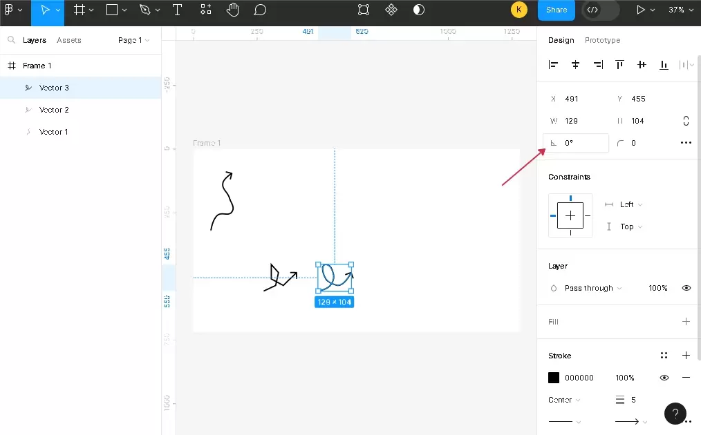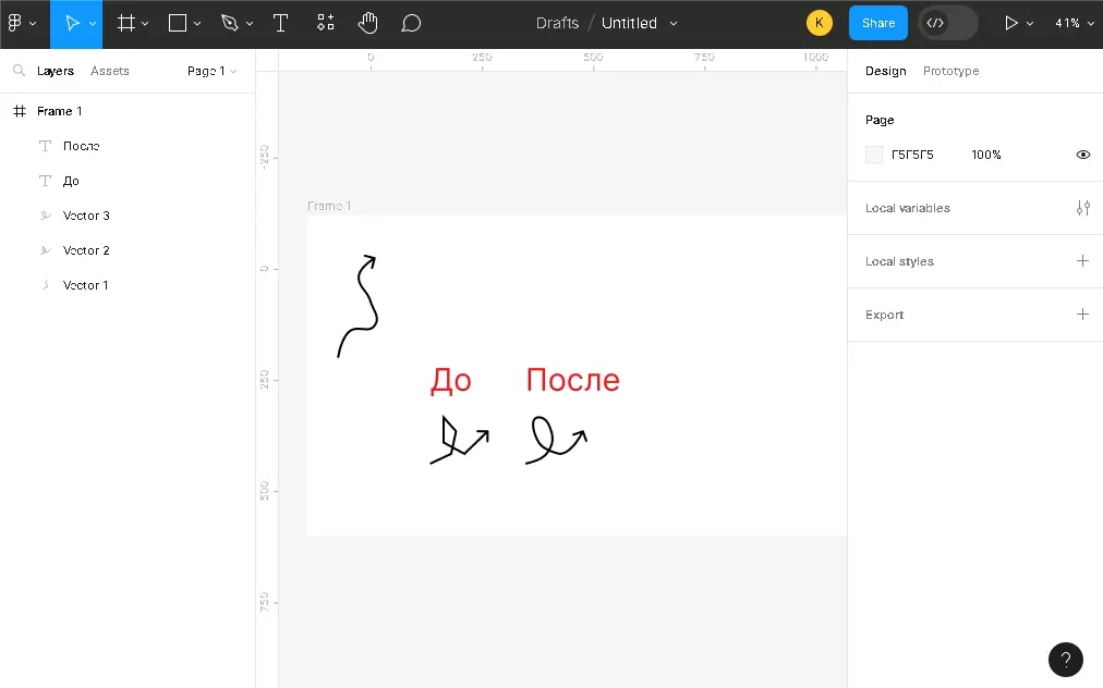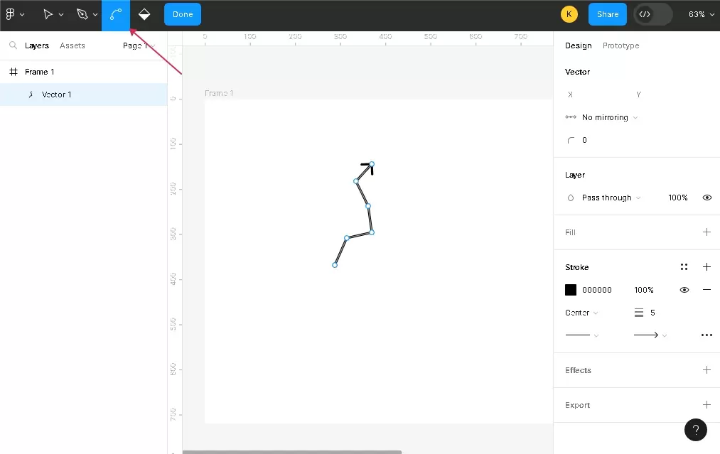 Выше привели пример заставки, где добавлена стрелка на картинке. Указатель был скачан с фотостока, потом вырезан через графическую программу и добавлен в макет фигма. Однако вы сами сможете создавать стрелки, используя возможности figma. Сейчас покажем, как это сделать. Возьмем инструмент pen и нарисуем кривую, просто расставляя точки.