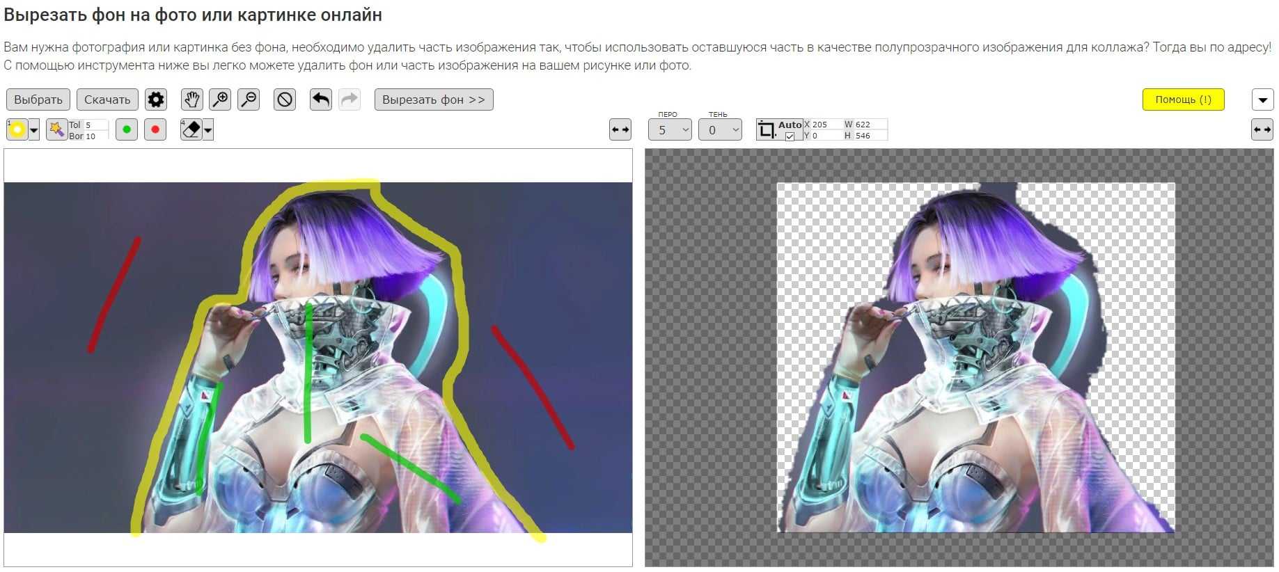 Есть у него и небольшие недостатки – некоторая сложность в работе и недостаточная интеллектуальная способность. Чтобы произвести удаление фона онлайн, нужно загрузить фото, очертить границы желаемой области желтым пером. Затем придется зеленым цветом сделать мазки мест, которые должны остаться, а красным – те, что следует удалить. Для быстрой очистки фона сервис не подходит, но он хорош в тех случаях, когда важна точность обработки.