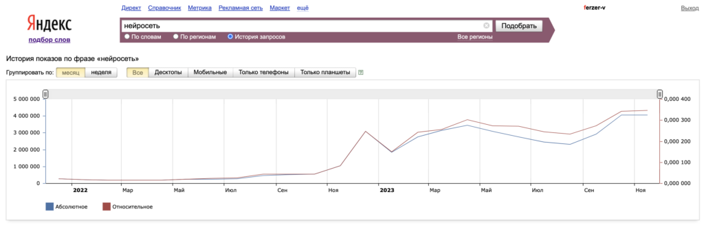 По динамике запросов в «Яндекс Вордстат» видно, что в целом интерес к нейросетям продолжает расти с конца 2022 года