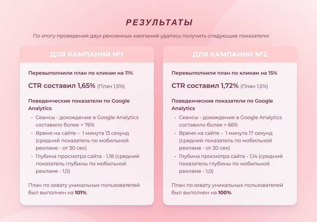 Было проведено две кампании. Для первой выбрана тематика “Спорт”, а для второй – “Здоровье, ЗОЖ”. С помощью ежедневной ручной оптимизации нам удалось достигнуть отличных поведенческих показателей.