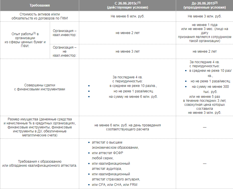 Сейчас я рассмотрю, как стать привилегированным участником финансового рынка обычному инвестору. Физическое лицо должно соответствовать одному из перечисленных требований: