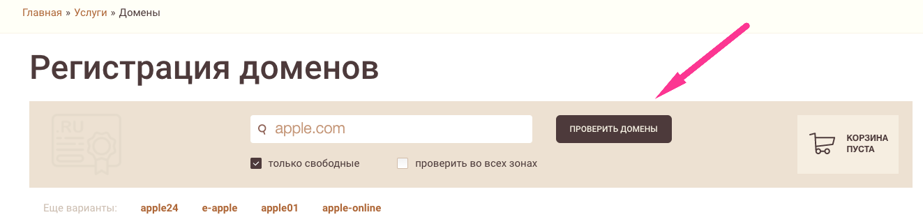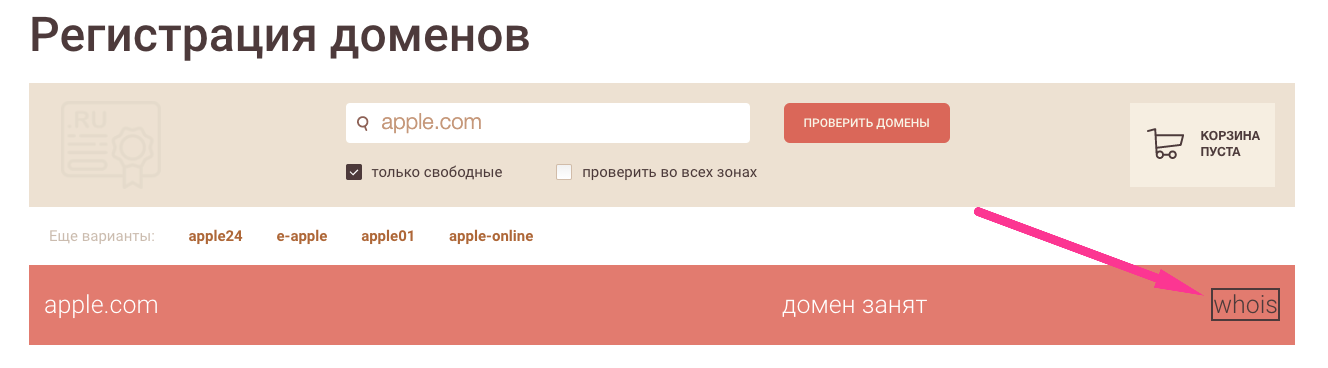 - Ждем несколько секунд. Сервис покажет, что домен Apple занят. Жмем на кнопку «WHOIS».