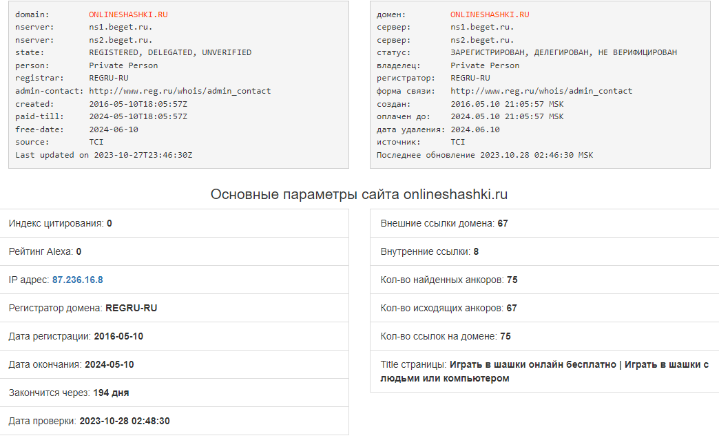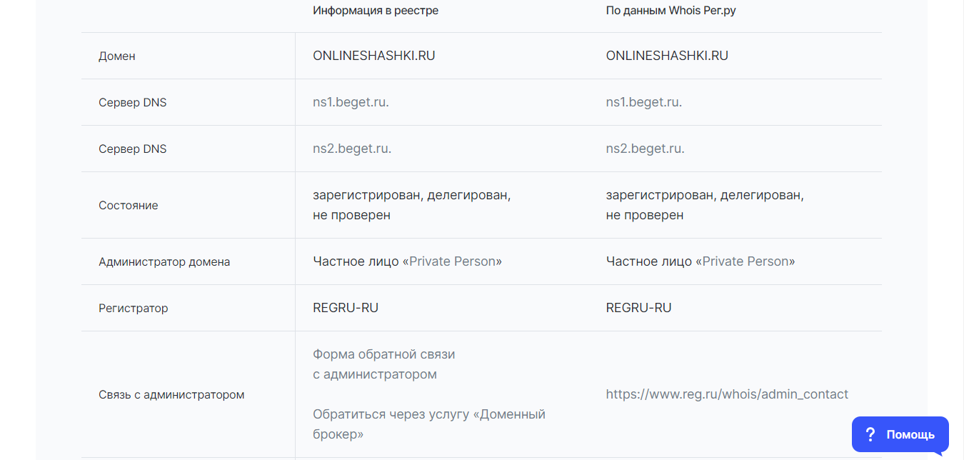Если воспользуемся WHOIS-сервисом от хостера Рег.ру, он покажет ту же самую информацию.