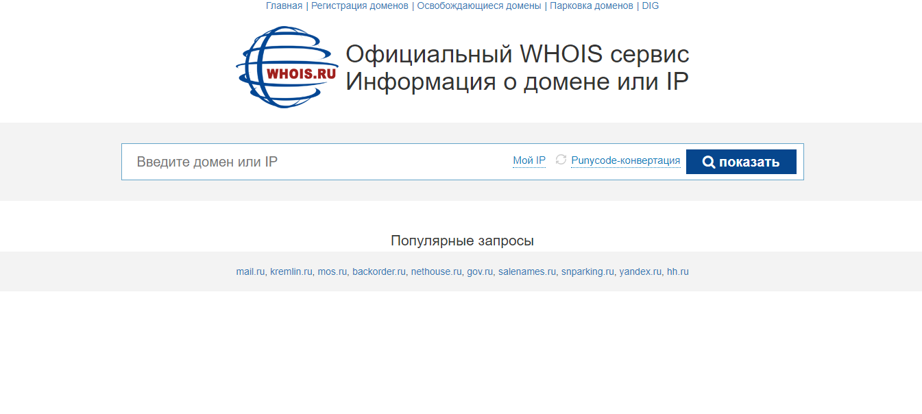 Сейчас WHOIS-клиент есть у большинства хостинг-провайдеров – Рег.ру, Hoster.ru и других. Воспользуемся самым популярным – WHOIS.RU.