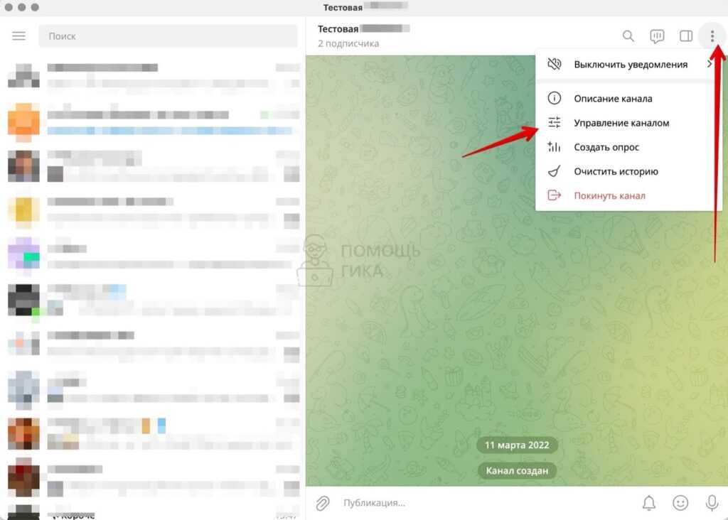 Чтобы через десктопный клиент Телеграм включить комментарии в канале под постами, зайдите в тот канал, где вы являетесь администратором, и нажмите в правом верхнем углу на 3 точки. В выпадающем меню выберите «Управление каналом».