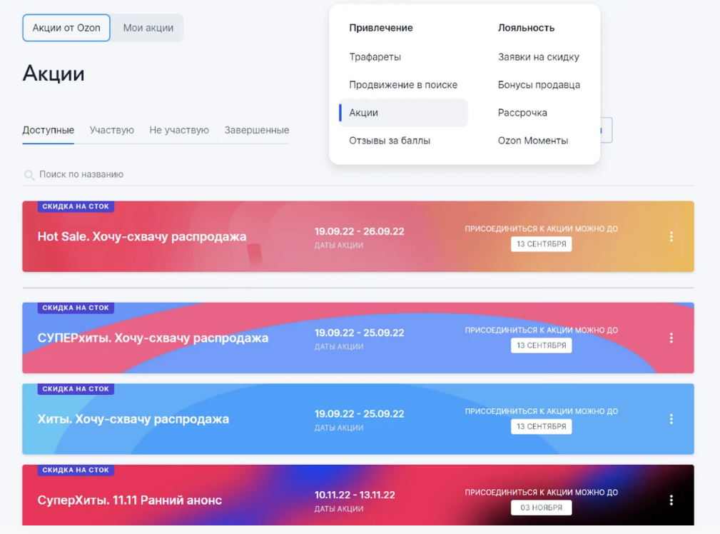 Рассмотрим, какие основные разделы, вкладки и параметры их настройки представлены в личном кабинете селлера “Озон”.