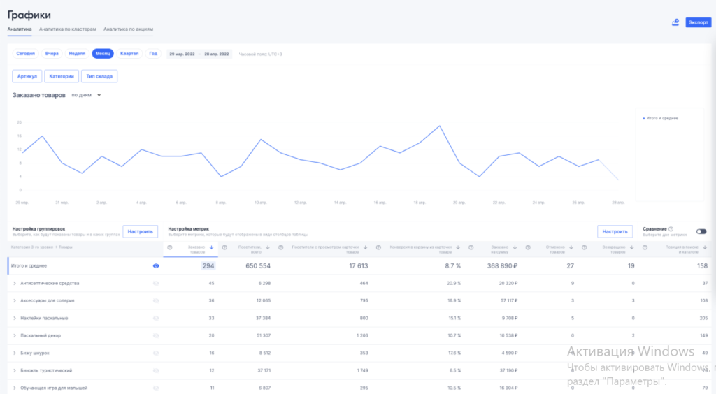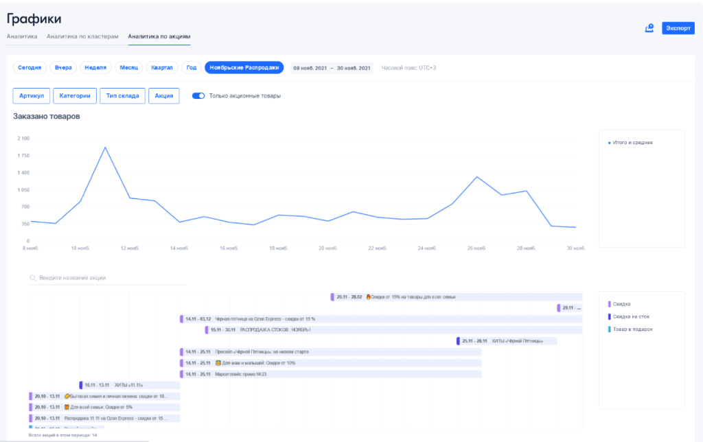 Вкладка “Аналитика” — тут отображается аналитика продаж на “Озоне” и не только. Маркетплейс предоставляет различную статистику по наиболее популярным поисковым запросам, а данные можно узнавать по различным типам — по товару, категории, региону продаж. Словом, дается информация, которая может помочь с планированием бизнеса или подсказать варианты смены ниши.