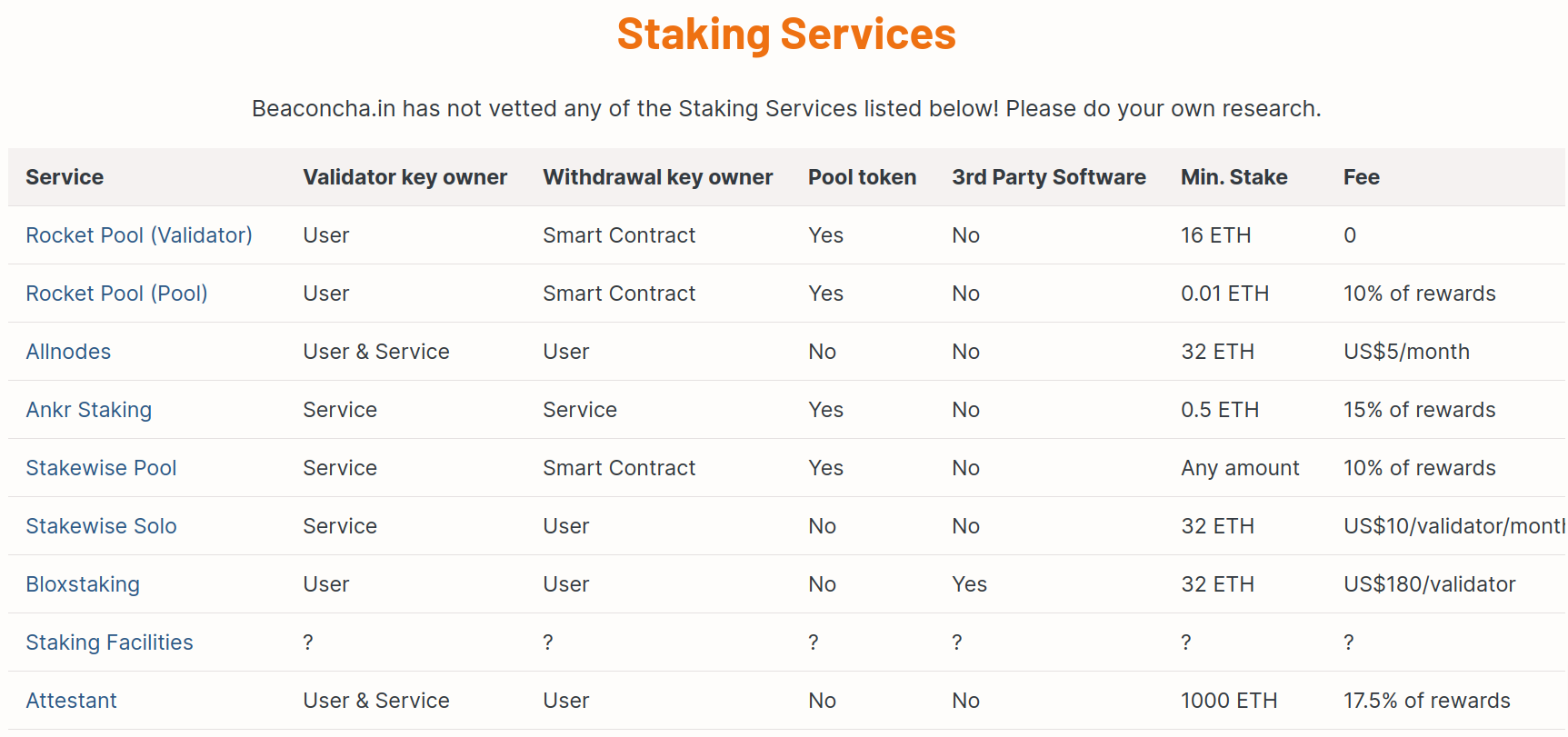 Подборка пулов от beaconcha.in — сервиса, рекомендованного командой Ethereum. Не забудьте провести собственное исследование перед тем, как доверить средства пулу.