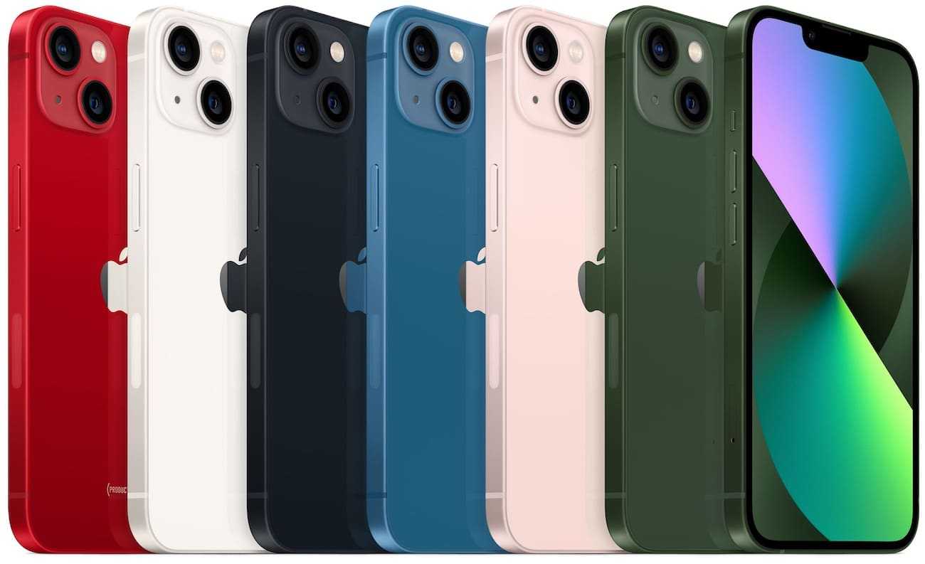 iPhone 13 предлагается в шести расцветках: красный, белый, черный, синий, розовый и зеленый.