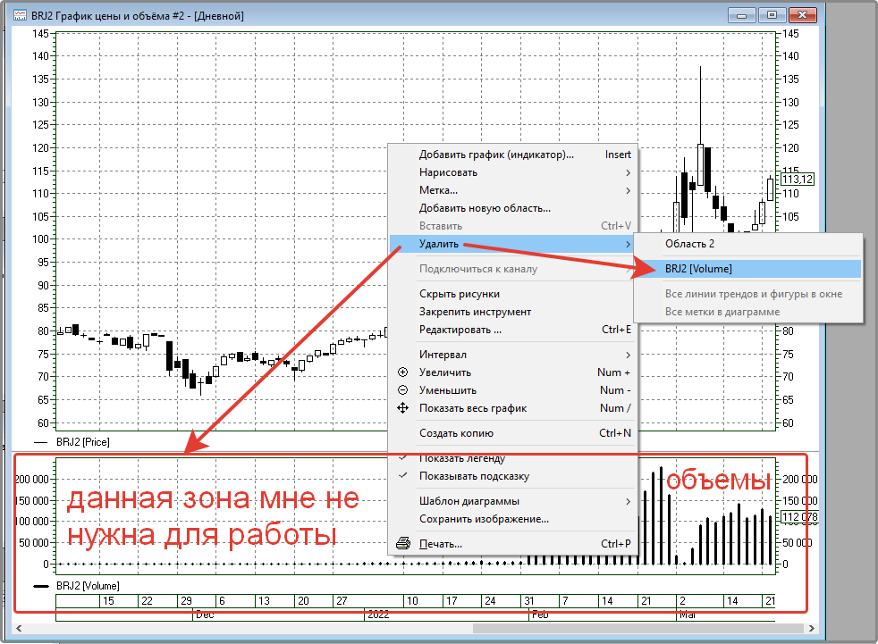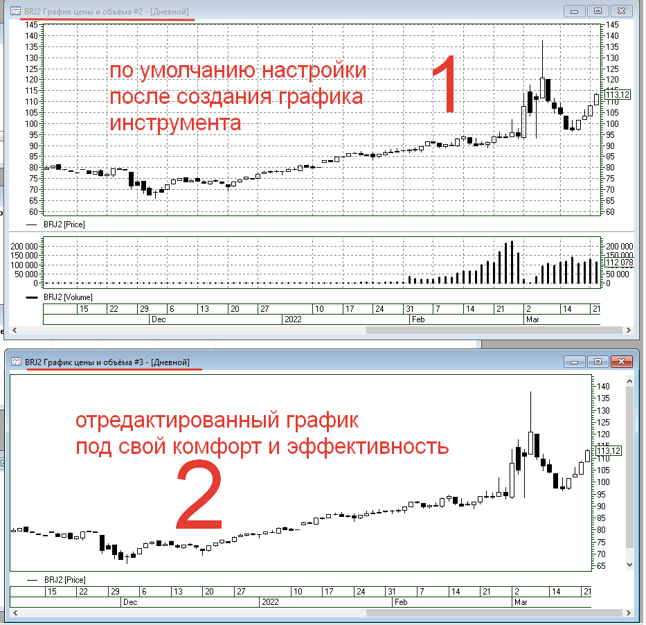 На графике фьючерса BRENT при создании графика нагромождается, помимо важной информации, сеткой, объемами торгов (на окне снизу). Шкала времени и слева и справа