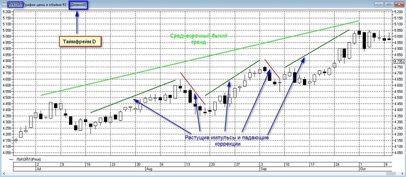 И это вполне объяснимо. Ведь если цена анализируемого финансового актива повышается в течение 2–3 месяцев, то такой рост редко бывает линейным. Такой среднесрочный тренд состоит из импульсов и коррекций, которые образуются краткосрочными тенденциями.