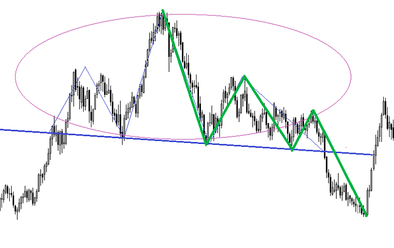 Цена дважды «пробивала» уровень предыдущей впадины. Хотя в целом нисходящее движение сохранялось.