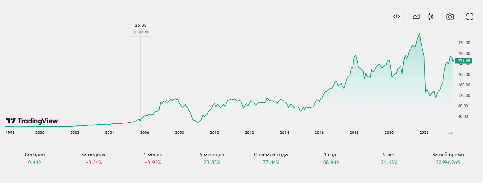 А вот так выглядит исторический график акций «Сбера» — в течение 25 лет акции дешевели и дорожали десятки раз.