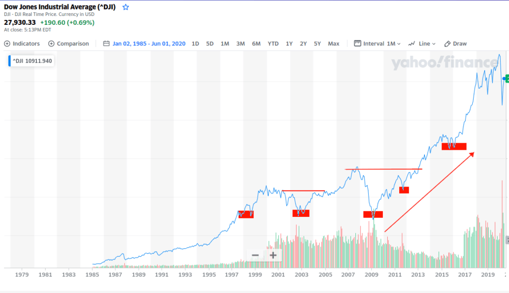 Если мы долго формировали капитал и хотим получить отдачу в обозримой перспективе, точка входа становится ключевым фактором. Вот несколько примеров (за образец возьмем «вечнозеленый» индекс DJI).