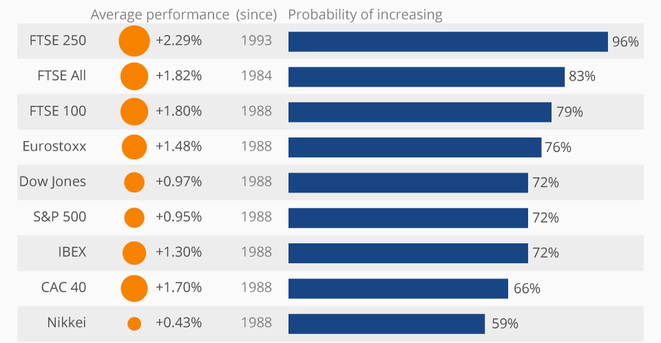 Но не акциями из США едины. Другие мировые индексы тоже в целом показывали подобную новогоднюю динамику. Британская компания по управлению активами Schroders провела исследование, проанализировав доходность индексов за почти тридцатилетний период. И рынок Великобритании за весь период оказался самым производительным на «скачках Санты»: индекс FTSE 250 рос в среднем на 2,29 % с 25 декабря по 2 января начиная с 1993 года.