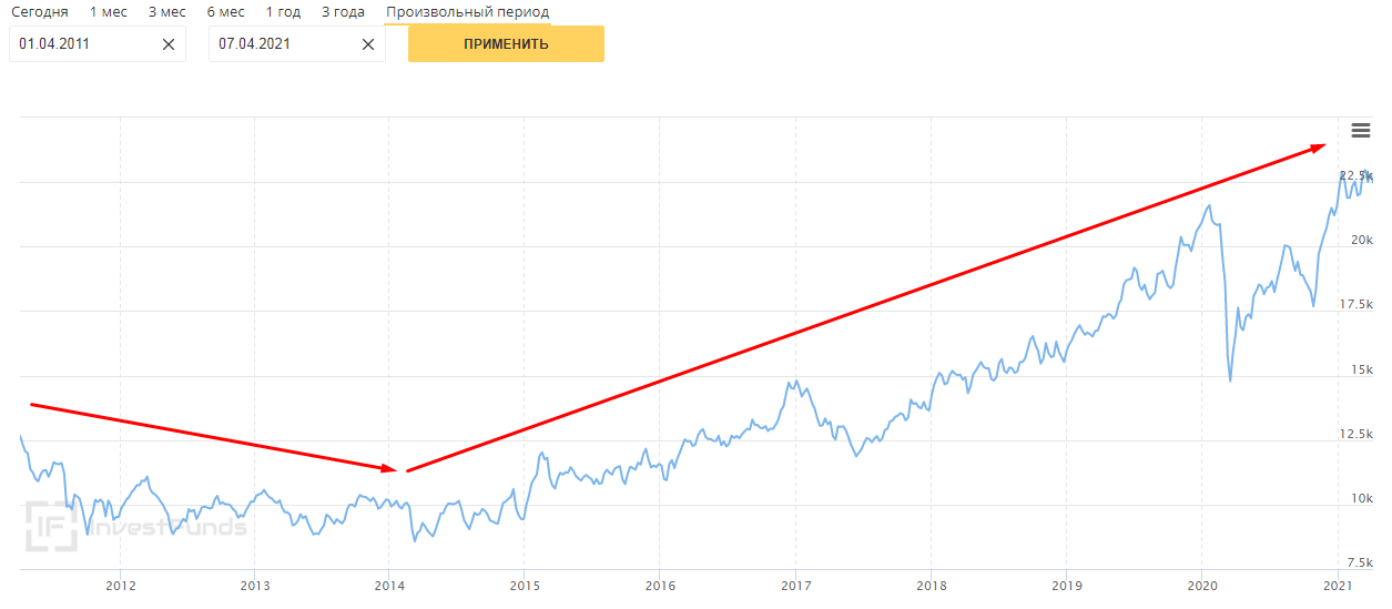 Когда вы вложитесь в пай фонда, вы купите одновременно несколько акций. Какие-то из них просядут в цене, какие-то подрастут. В целом фонды чаще растут, чем падают. Например, если фонд инвестирует в акции из индекса S&P 500, то есть в 505 крупнейших компаний США. Посмотрите на динамику этого индекса.