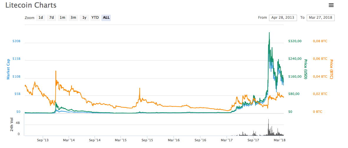 Лайткоин называют цифровым серебром, хоть он давно потерял позицию в верхушке рейтинга криптовалют. Произошло это по довольно прозаичной причине, которая стала для лайта фатальной в 2014 году. Если изначально монета пользовалась популярностью и считалась альтернативой и одновременно заменой битка (на случай если с ним, не дай бог, что-то случится), которая за день могла подыматься в своей стоимости на 100%, то с изменением сложности добычи и снижением вознаграждения для криптовалюты начался настоящий кризис.