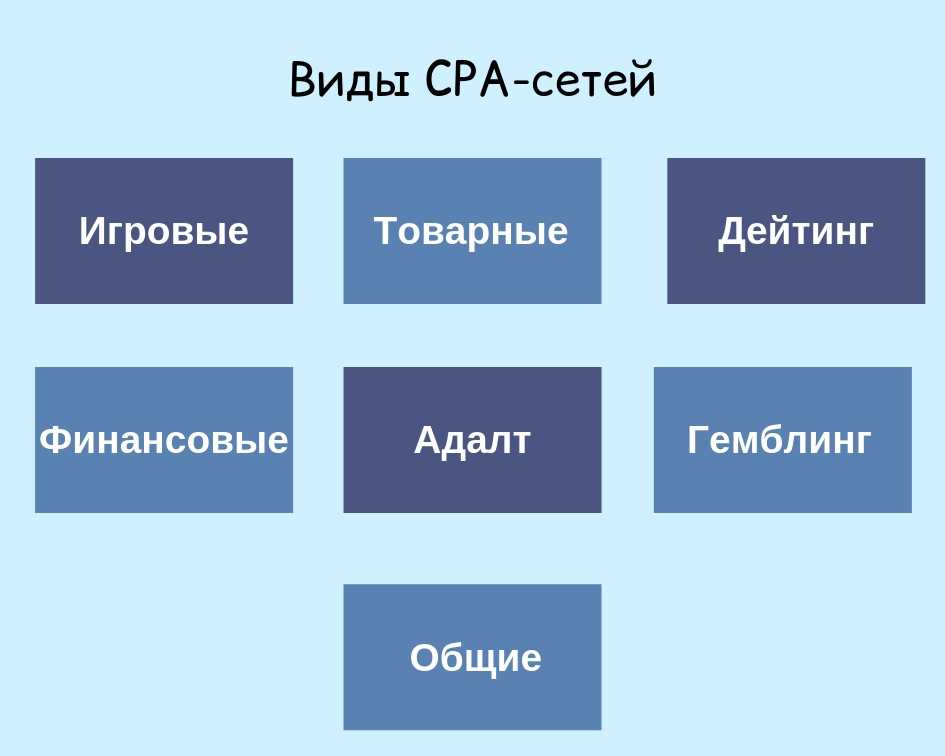 Также можно разделить партнерки по типу оплаты за результат. Хотя выше мы обозначили, что в основе названия лежит аббревиатура CPA — оплата за действие, на самом деле видов оплат больше.