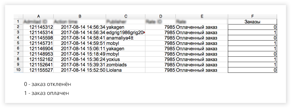 В таблице вы заполняете только одно поле «Заказы», единица означает оплаченный заказ, ноль – отклоненный. Причина отклоненного заказа может быть любой: заказ накручен ботом, не указали нужный адрес или телефон, заказчик передумал покупать и т.д. Напомню, что за отклоненные заказы вы не платите.