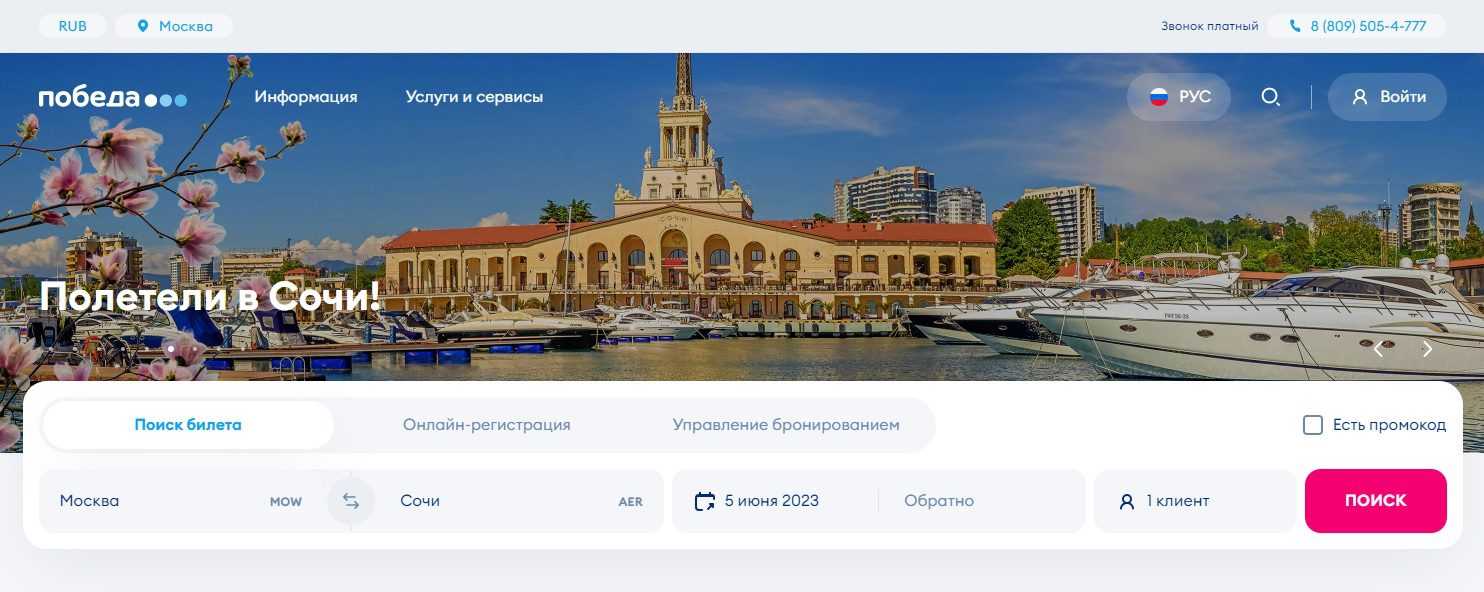 Процесс покупки авиабилетов Победы выглядит следующим образом: