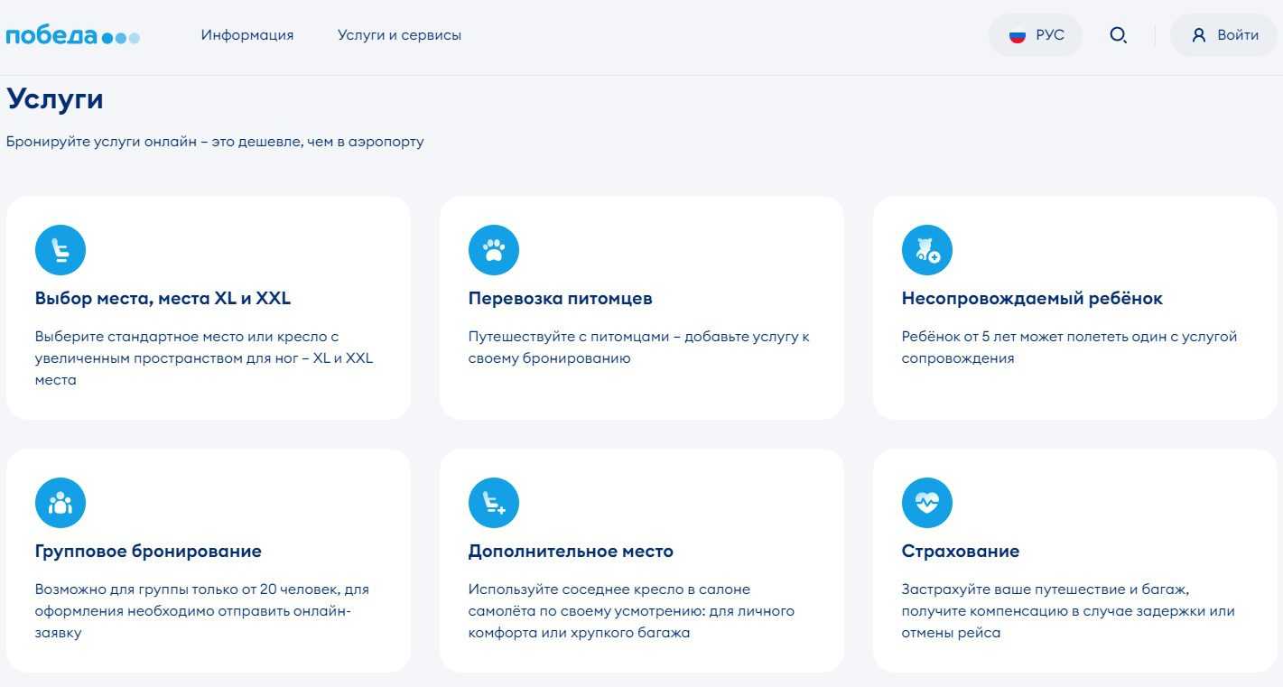 Прежде всего стоит отметить, что авиакомпания Победа — это лоукостер, то есть такой авиаперевозчик, который ради незначительного снижения цены билета не включает в её стоимость большинство привычных нам услуг.
