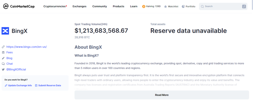 Второе место занимает криптобиржа BingX, которая за последнее время показала достаточно стремительный прогресс среди других конкурентов. По данным CoinMarketCap, спотовый объем в сутки составляет более 1,2 млрд долларов. Информация о резервах биржи не разглашается.