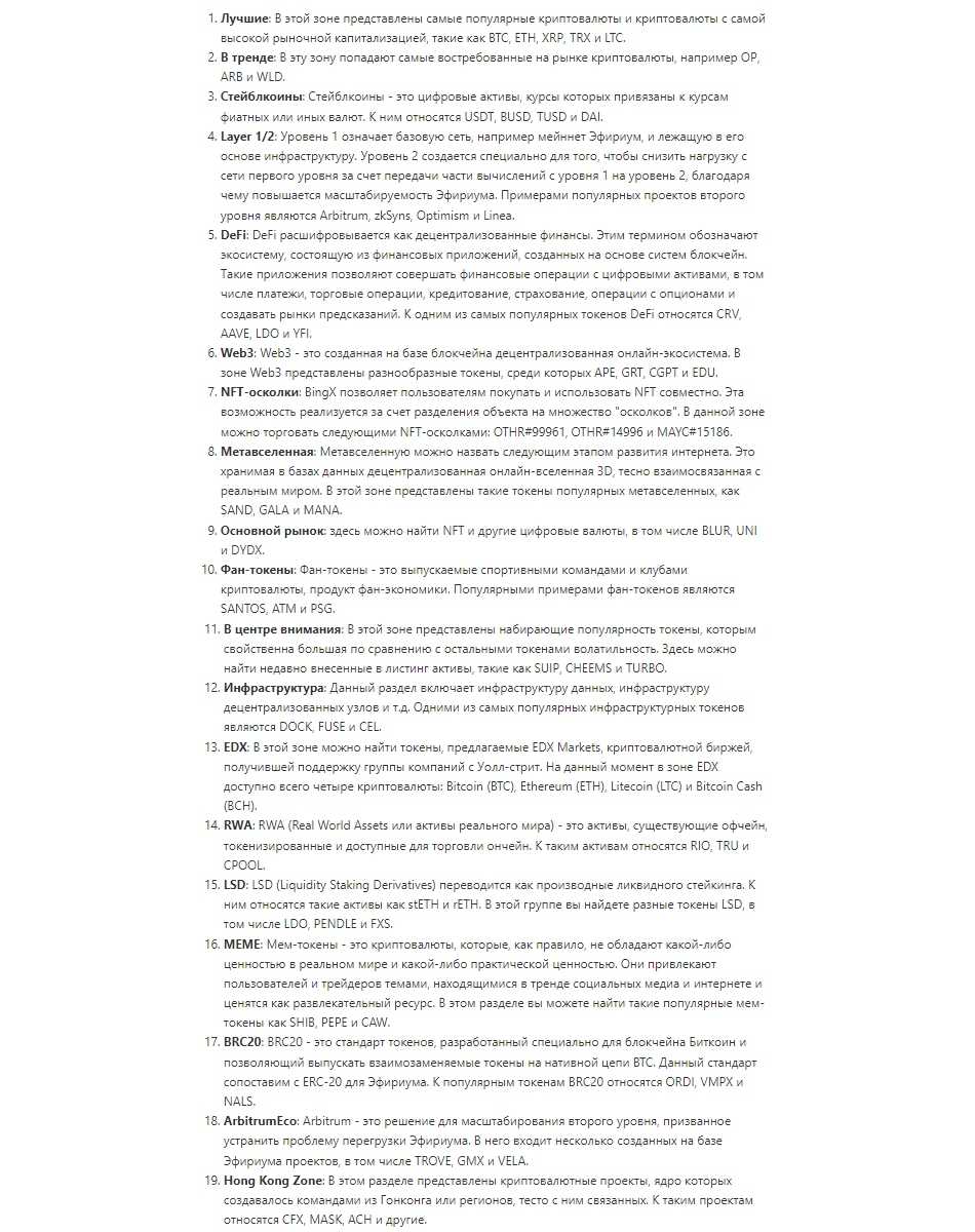 В первую очередь, это спотовая и фьючерсная торговля. Фьючерсы разделены на стандартные и бессрочные. Также можно торговать валютными парами, что является достаточно большой редкостью среди других криптобирж. В общем, у пользователя есть возможность торговли более 550 криптовалютами и 600 торговыми парами. Ниже вы можете ознакомиться с подробным списком торговых токенов: