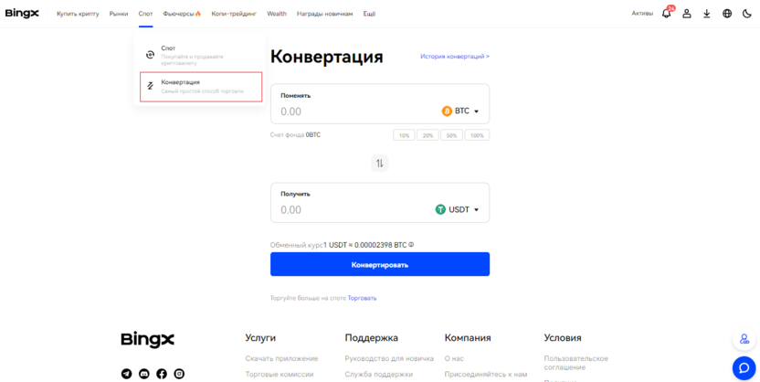 Конвертация. В разделе «Cпот» можно перейти на страницу «Конвертация», где возможно обменивать различные торговые активы на другие – без каких-либо задержек и комиссий.