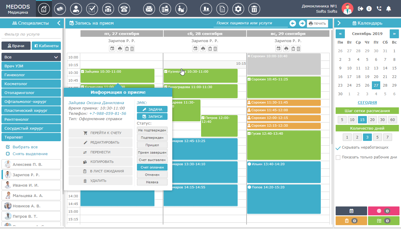 Регистратура. Облегчает и автоматизирует работу медрегистратора. Это про запись на прием, перенос времени и даты, информирование пациентов и врачей и так далее;
