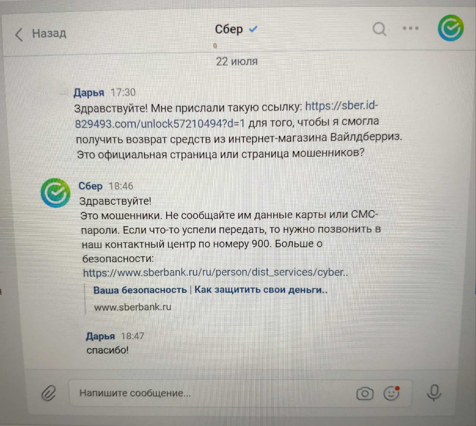 Затем я написала в поддержку Сбербанка вопрос, является ли платёжная страничка, которую мне дали, их страницей или это мошенники. Сбербанк ответил, что это мошенники и мне нужно заблокировать карты и обратиться в полицию.