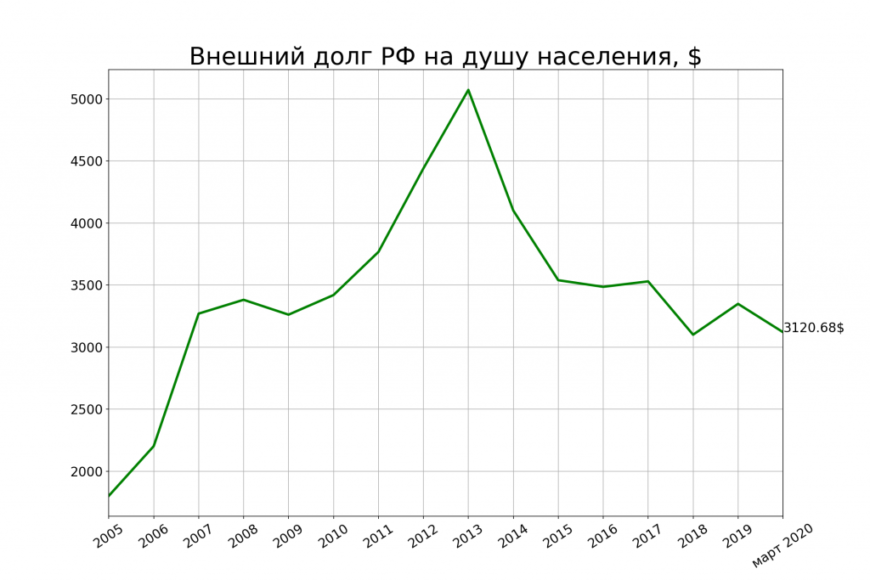 Много! Но для оценки возможности дефолта стоит учитывать только внешние заимствования. Почему? Потому что внутренний долг выражен в рублях. А кто их печатает? Правильно, государство. В любой момент власти могут напечатать любое количество денежных знаков и раздать людям. Да, инфляция будет зашкаливать, но долги, юридически, будут возвращены.