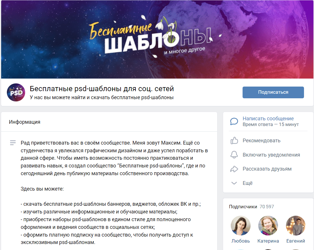 Скачать готовые шаблоны в сообществе ВК → «Бесплатные psd шаблоны для соцсетей».