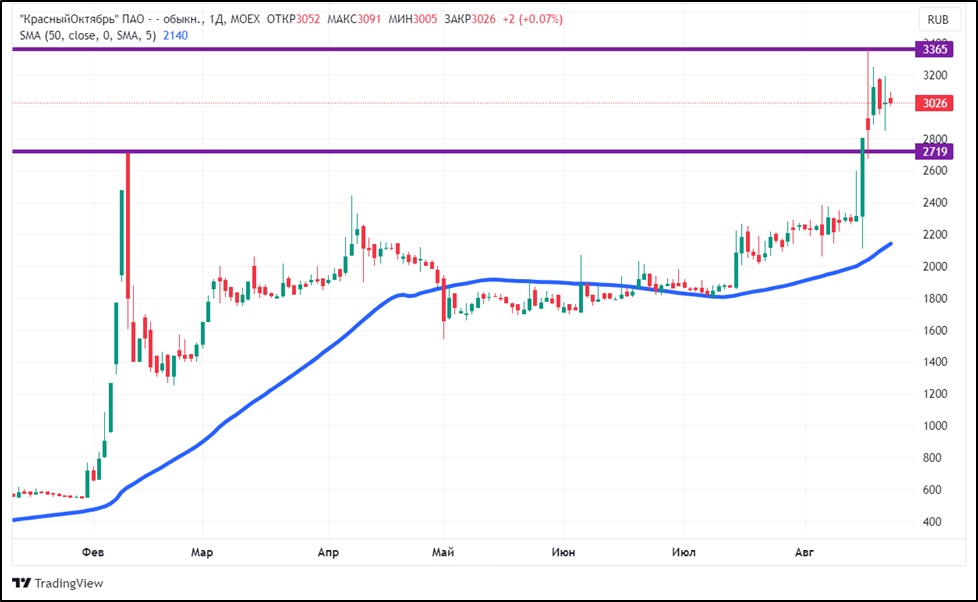 Естественно, что при таких результатах все ценовые индикаторы будут либо зашкаливать, либо показывать дальнейший рост. Например, цена акций «Красный октябрь» естественно торгуется выше 50-дневной скользящей средней (обозначена синим). Для продолжения бычьего тренда необходимо преодолеть уровень сопротивления — 3 365 рублей. Уровнем поддержки выступает максимум февраля 2023 года — 2 719 рублей. Наглядно это можно увидеть из дневного свечного графика ниже.