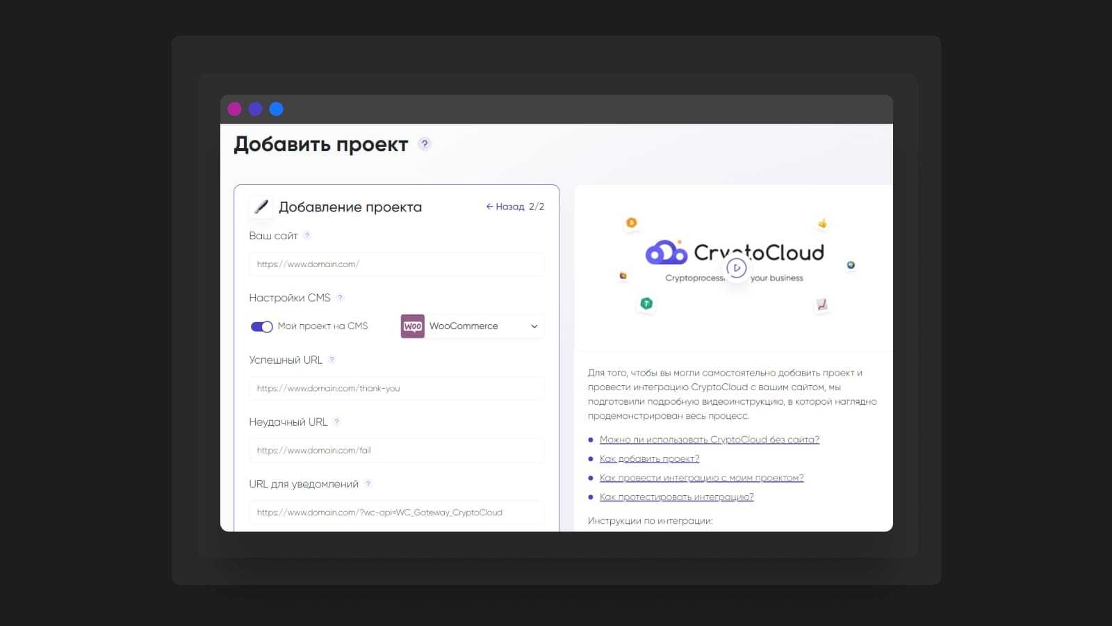 - Заполните форму и добавьте свой проект, следуя подсказкам над полями. При выборе CMS укажите Woocommerce.