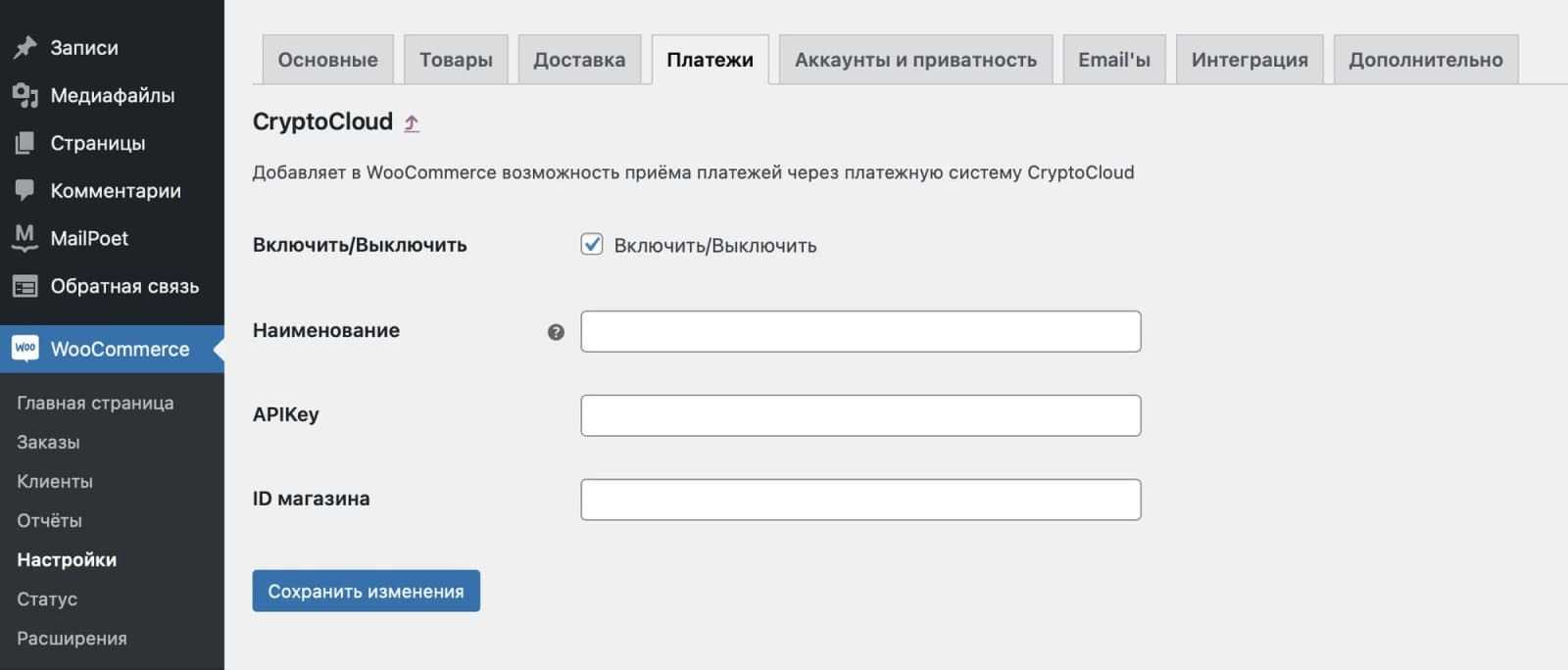 - Настройте CryptoCloud в подразделе «Платежи» внутри раздела «Настройки» во вкладке Woocommerce.