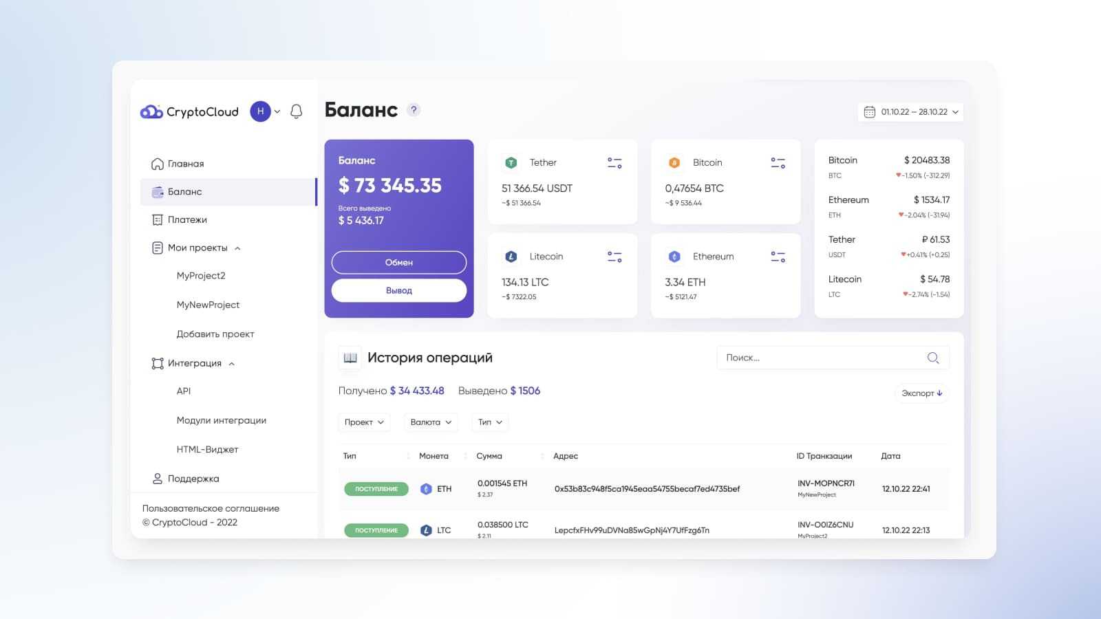 Кроме того, в вашем личном кабинете вы сможете отслеживать текущий баланс по всем доступным криптовалютам, просматривать историю созданных и оплаченных счетов, а также экспортировать всю информацию в виде таблицы.