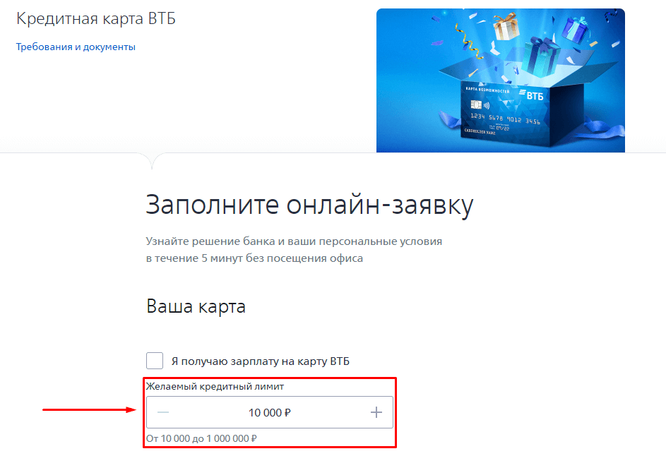 Для этого переходим на сайт ВТБ, и указываем желаемый кредитный лимит (рис. 1). Сумма не может быть меньше 10.000 или больше 1.000.000 рублей.