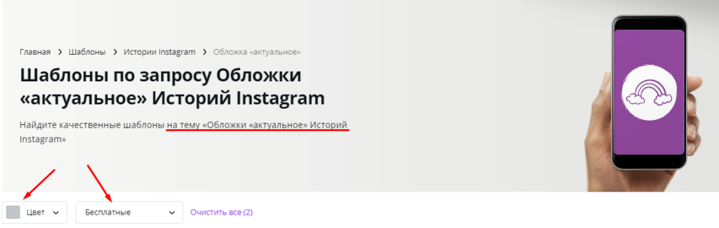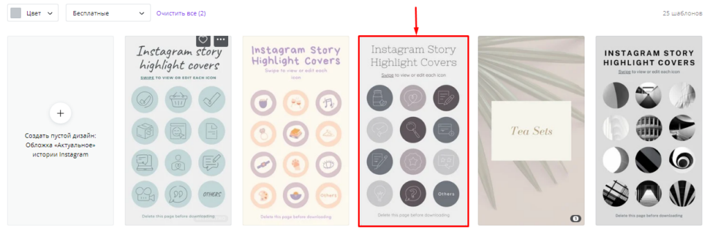 Здесь есть подраздел «Обложка актуальное», в котором уже собраны готовые шаблоны обложек для хайлайтов. Шаблоны можно отфильтровать по цвету, а также вывести только бесплатные (или только платные).
