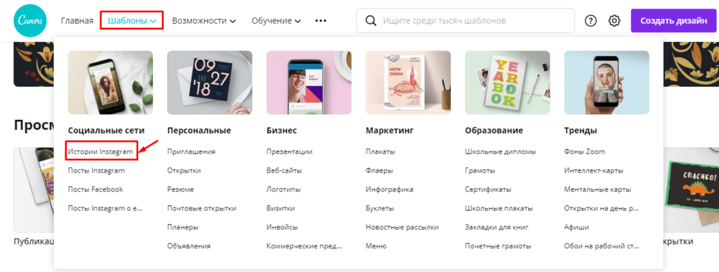 Создаем аккаунт в сервисе, при создании нового дизайна выбираем шаблон «Истории Instagram*».
