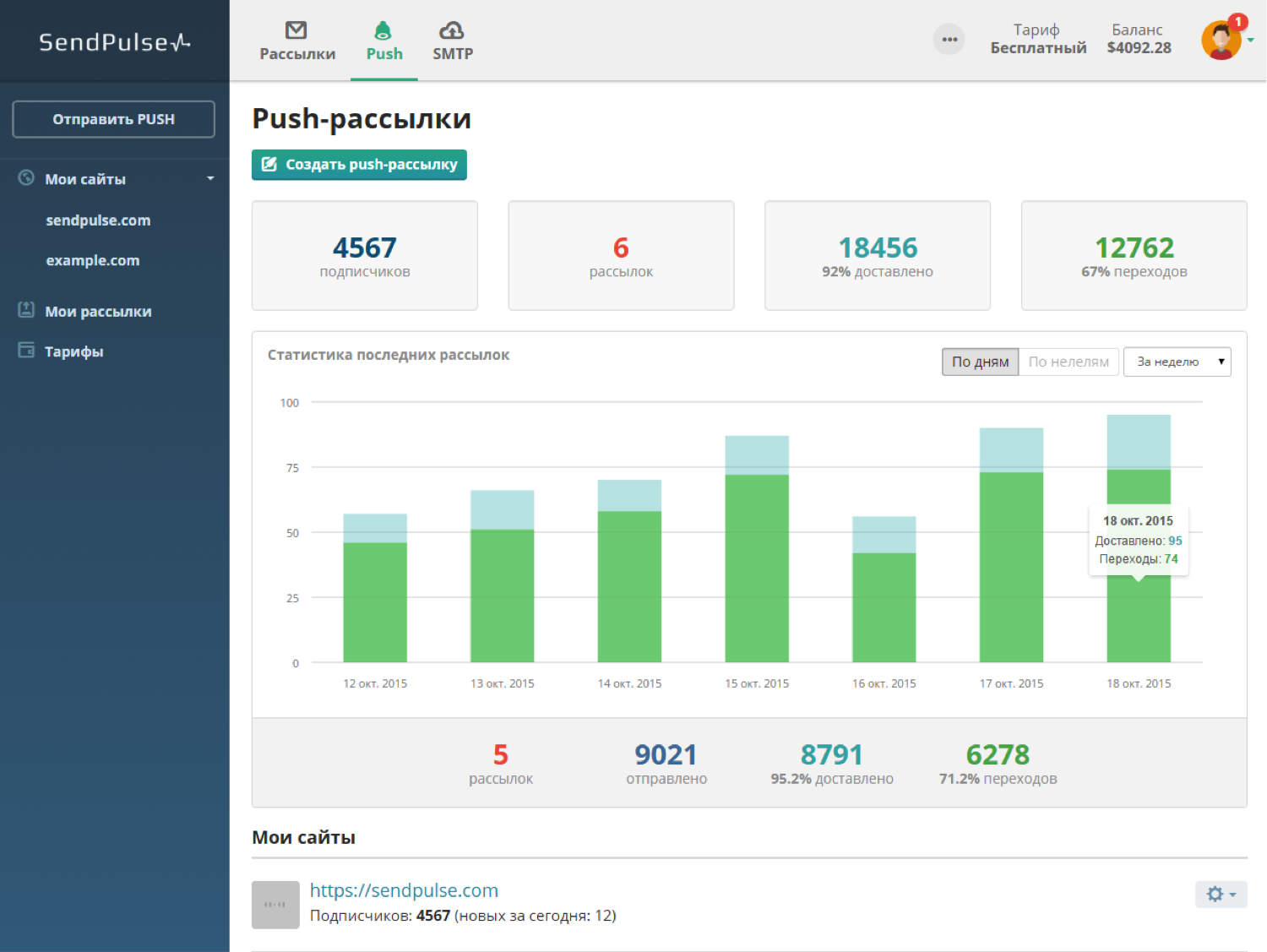 Самый известный аналог еСпутника – уже упоминавшийся SendPulse. Это проверенный ресурс с хорошим функционалом. По сравнению с еСпутником у него есть один небольшой недостаток – количество push-уведомлений в месяц ограничено при любом тарифном плане.