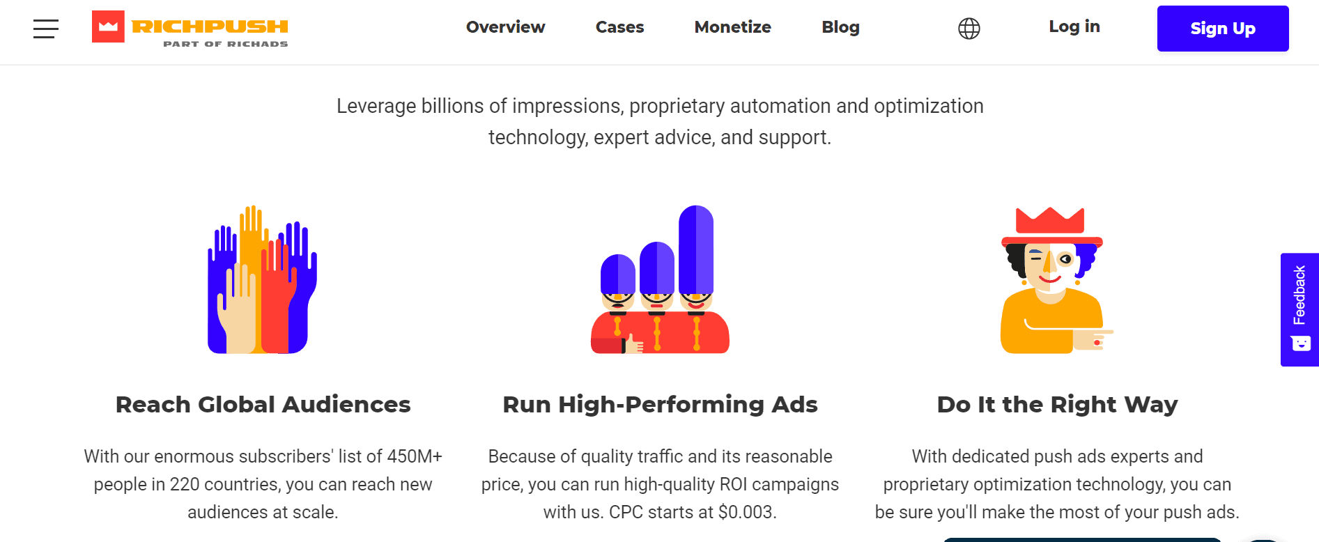 Особняком стоит Realbig.media и некоторые другие похожие проекты: они могут работать и как простой сервис по рассылке push-уведомлений, и как рекламные сети. Владелец сайта может вступить в партнерство с другими проектами, предоставив им за определенные выплаты право рассылать web-push по своей клиентской базе. Если есть желание монетизировать push-уведомления вместо того, чтобы платить за их рассылку – стоит рассмотреть такие предложения. Но, естественно, это подвергает определенным рискам вашу клиентскую базу.